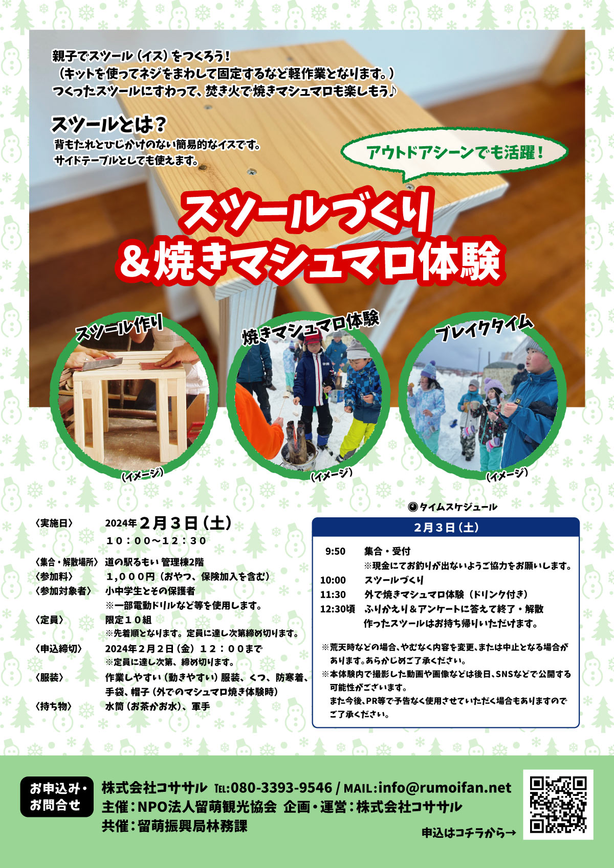 親子でスツール(イス)をつくろう! (キットを使ってネジをまわして固定するなど軽作業となります。) つくったスツールにすわって、焚き火で焼きマシュマロも楽しもう♪